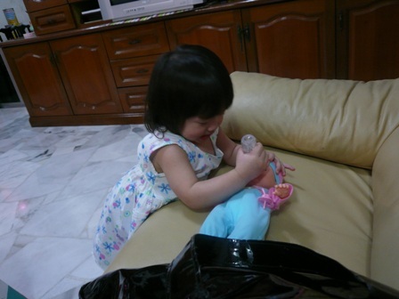 小阿姨買了會哭的娃娃給艾爾臻當生日禮物,正好可以先觀察艾爾臻照顧BABY的能耐,也可以讓她適應嬰兒的哭聲。 (其實我們都很期待艾爾臻被嚇到的反應,哈哈~ 從影片中幾個大人的談話就可以發現.....)